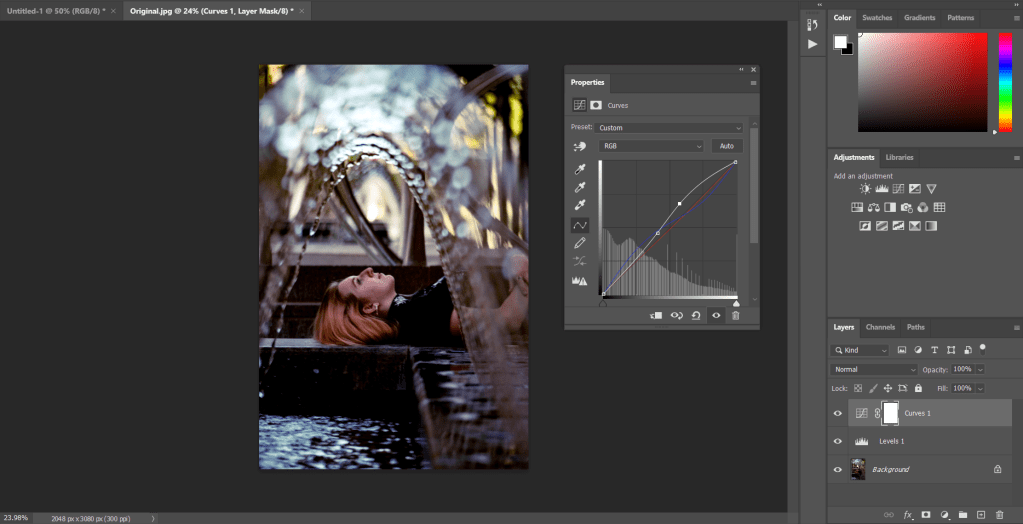 Curves, this is one of the most useful adjustment layers in photoshop and the one I use most often, it is similar to levels, but it’s more intuitive, you can change the highlights, mid tones, shadows, contrast (with an s curve) and you can change colors.