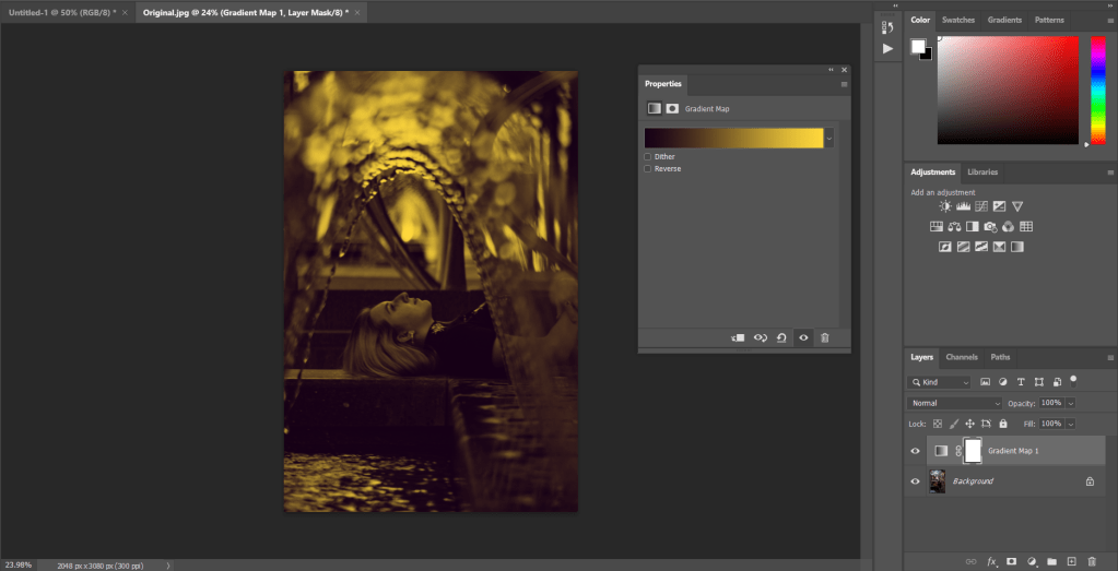 Gradient Map, this allows you to change the whites and the blacks of the image
