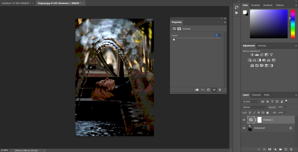 Posterize, this layer will take the 3 RGB color profiles and split them into levels, so when set to two levels, there are two Reds, two Greens, and two Blues, meaning there are only 6 total colors in the image.